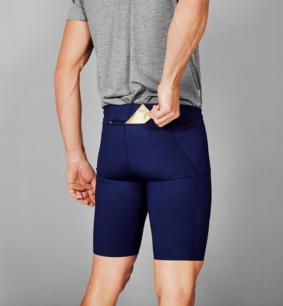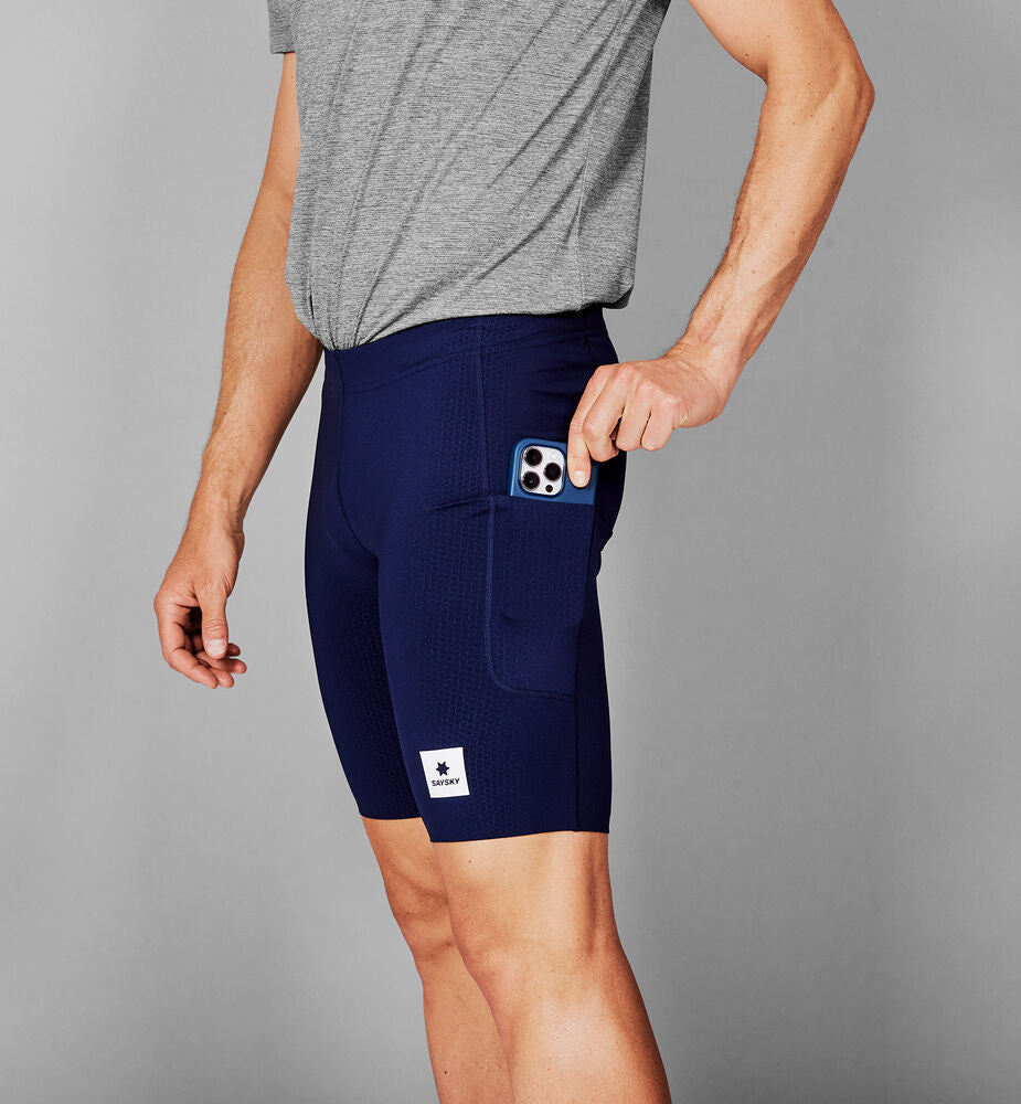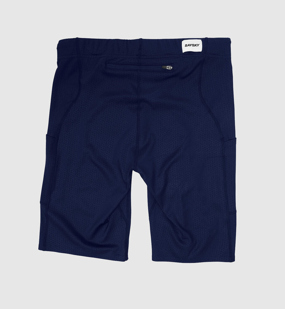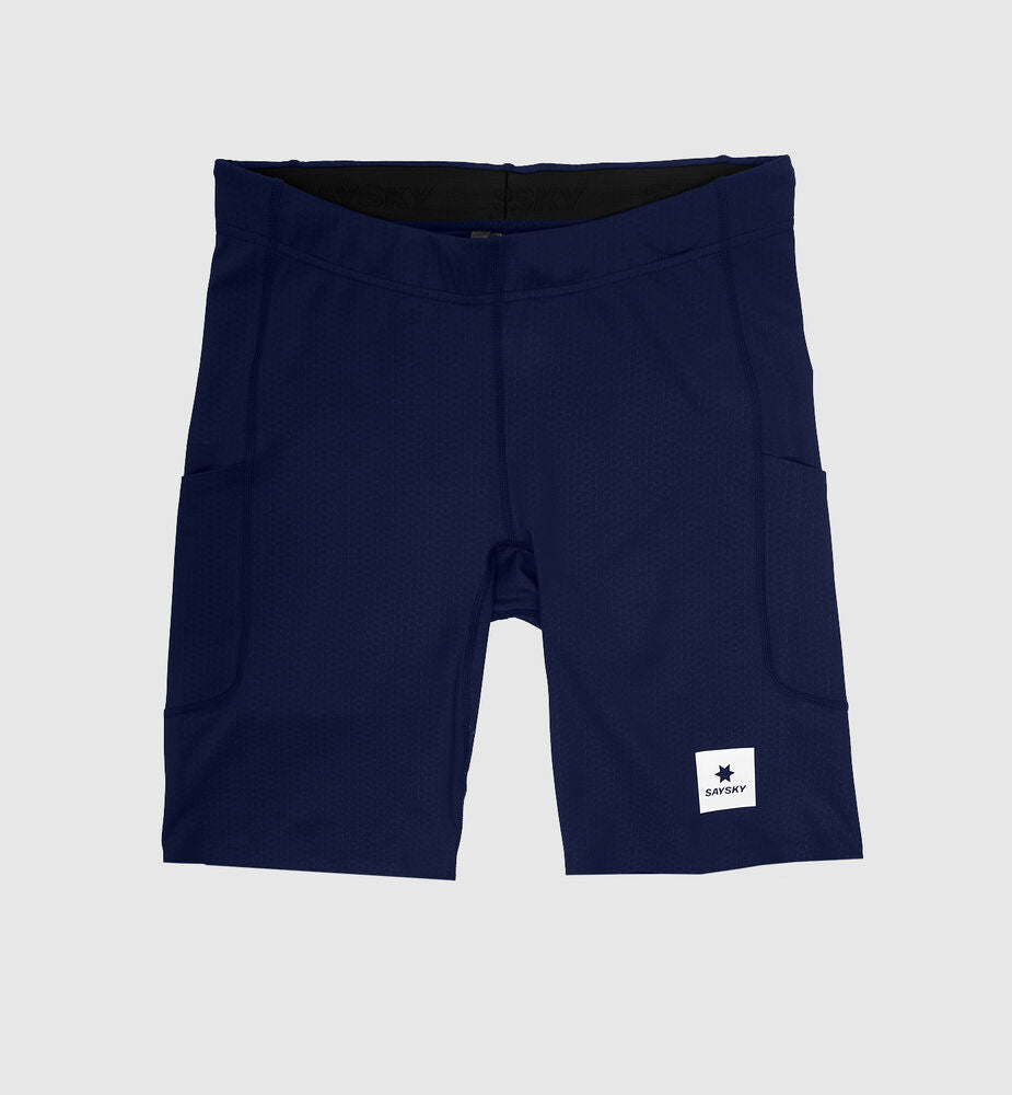 Combat Short Tights 9" er en kort løpetights av resirkulert polyester. Den kommer i blått med SAYSKY-logo på forsiden og en vevd logo bak. Shortsen har to sidelommer og en lomme bak. Passformen er slim med vanlig midje. Denne modellen er spesielt god for hurtig løping, også som et alternativ til lang tights i overgangssesongene.